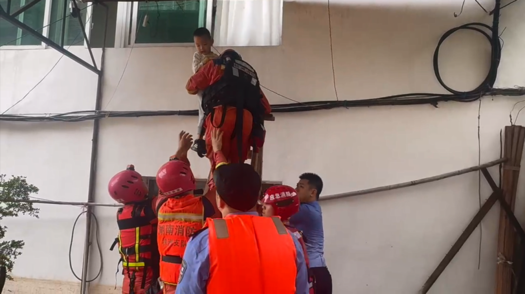 消防員立即趟水來到房屋側面,架梯靠近二樓窗口,小心翼翼地從奶奶手中接過孫子,一邊輕聲安撫驚慌失措的孩子一邊抱給身下接應的消防員。