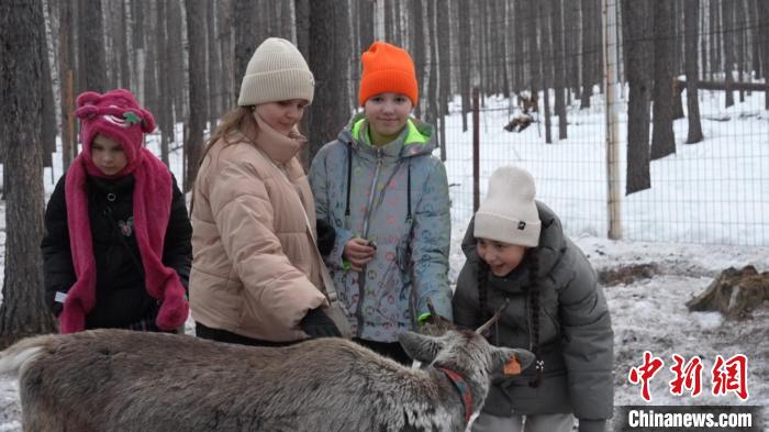 3月23日,內蒙古敖魯古雅鄂温克民族鄉,俄羅斯青少年與馴鹿合影。 劉明澤 攝