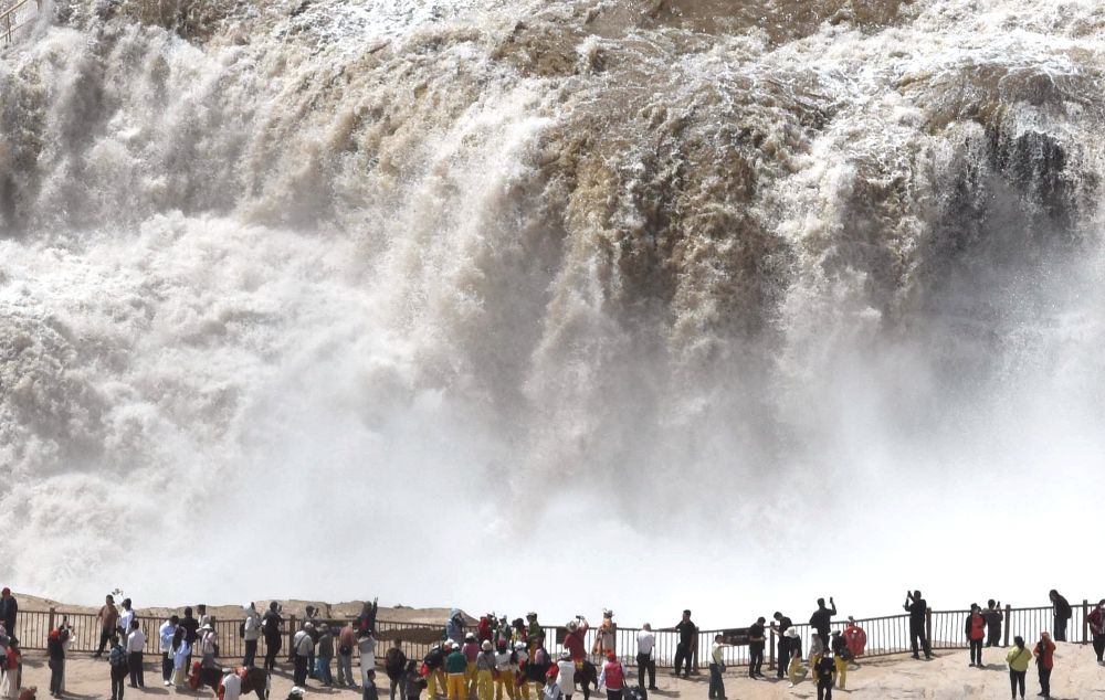 “風在吼,馬在叫,黃河在咆哮……”初夏,黃河壺口瀑布巨浪翻滾。一羣遊客自發唱起《保衞黃河》,神情激昂。