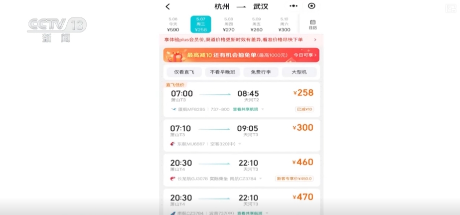 “五一”假期剛過,多家在線旅遊預訂平台的機票價格普遍下降。例如,從浙江杭州飛往成都、武漢、北京等地的單程機票最低僅需300多元。在杭州蕭山國際機場,有不少旅客選擇了在此時錯峯出遊。