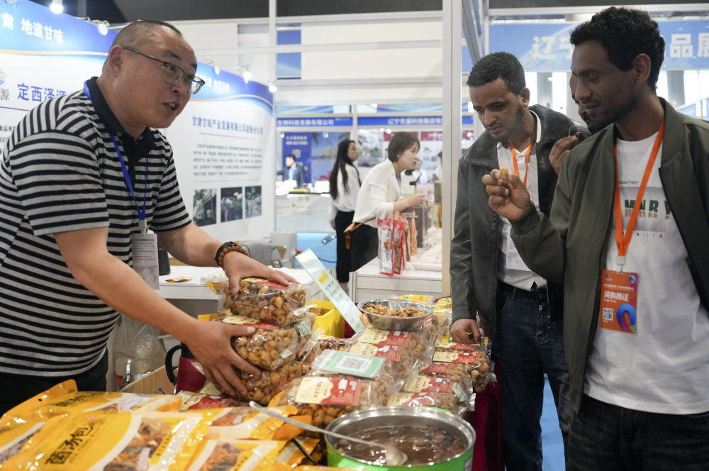 4月27日,參展商(左)在活動現場向採購商介紹商品。當日,“2025湖南內外貿一體化融合發展博覽會暨外貿優品中華行湖南站”在湖南株洲國際會展中心正式啓動。新華社記者 薛宇舸 攝