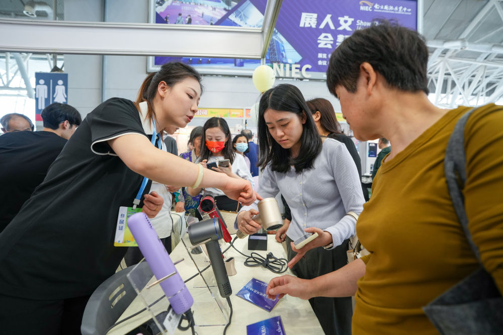 4月19日,工作人員在活動現場介紹吹風機產品。當日,2025年“外貿優品中華行江蘇站”首場活動在江蘇南京國際展覽中心舉行。新華社記者 李博 攝