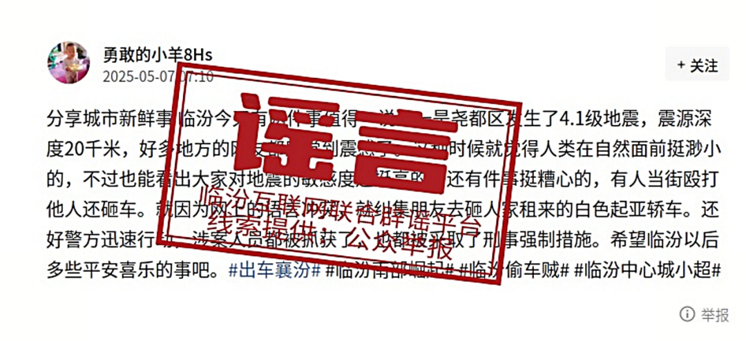 網民舉報,頭條號“勇敢的小羊8Hs”5月7日發佈文章稱:“臨汾今天有兩件事值得一説。一是堯都區發生了4.1級地震,震源深度20千米。”“還有件事挺糟心的,有人當街毆打他人還砸車。就因為網上的語言衝突,就糾集朋友去砸人家租來的白色起亞轎車。”