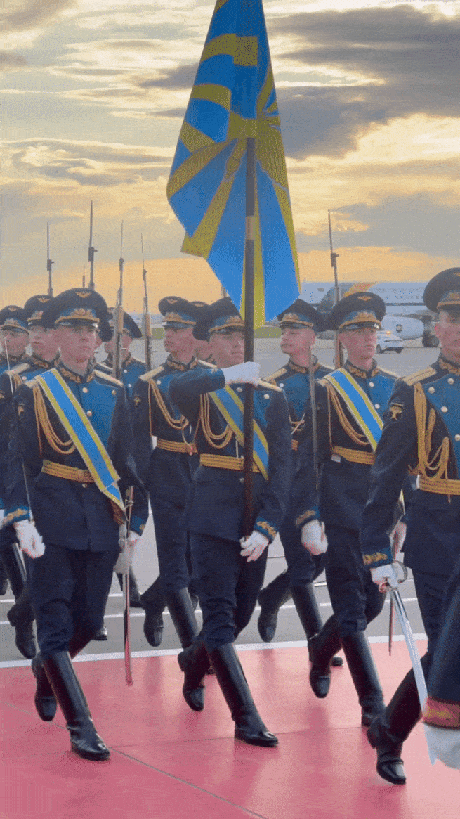 俄方在機場舉行隆重迎接儀式。軍樂團奏中俄兩國國歌。習近平檢閲儀仗隊並觀看分列式。