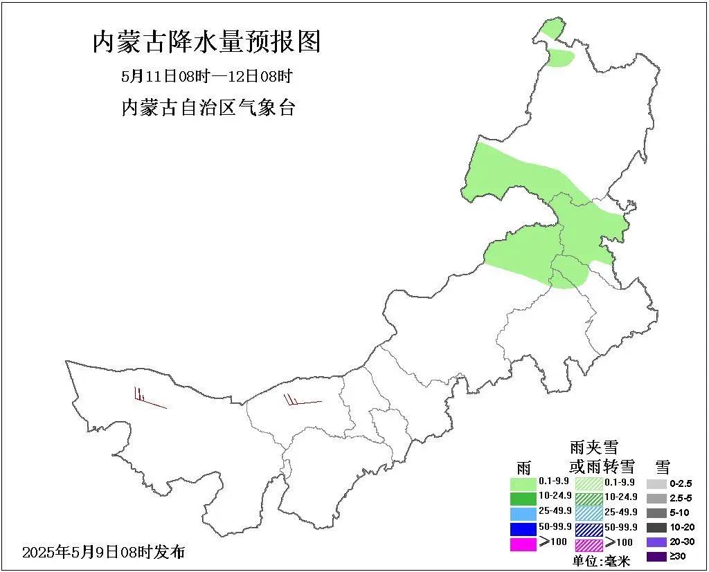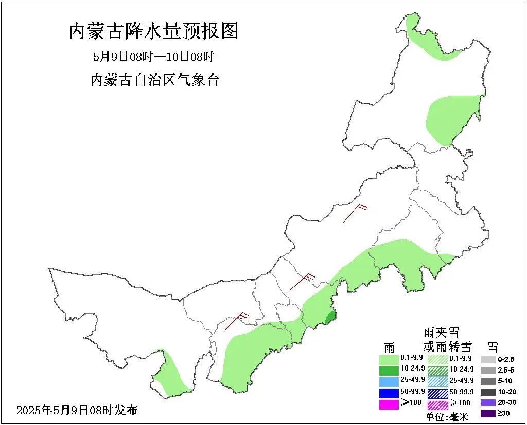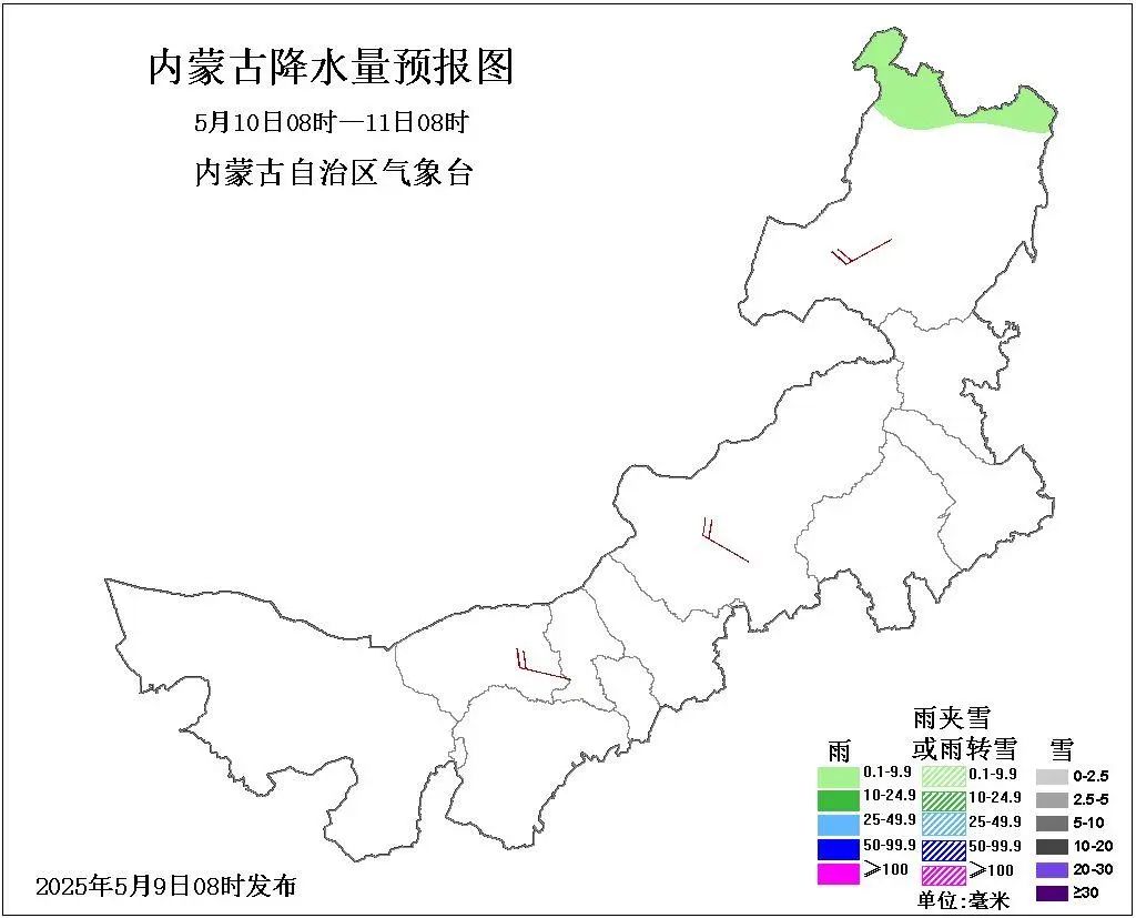 9日08時至10日08時,西部偏東及以東大部地區多雲,阿拉善盟東南部、鄂爾多斯市大部、包頭市東南部、呼和浩特市中部和南部、烏蘭察布市南部、錫林郭勒盟南部、赤峯市西部和南部、通遼市西南部、呼倫貝爾市東南部和北部偏北地區有小雨或雨夾雪,其中,烏蘭察布東南部有中雨或雨夾雪,其餘地區晴間多雲;西部偏東和中部大部地區4、5級短時6、7級偏東風。