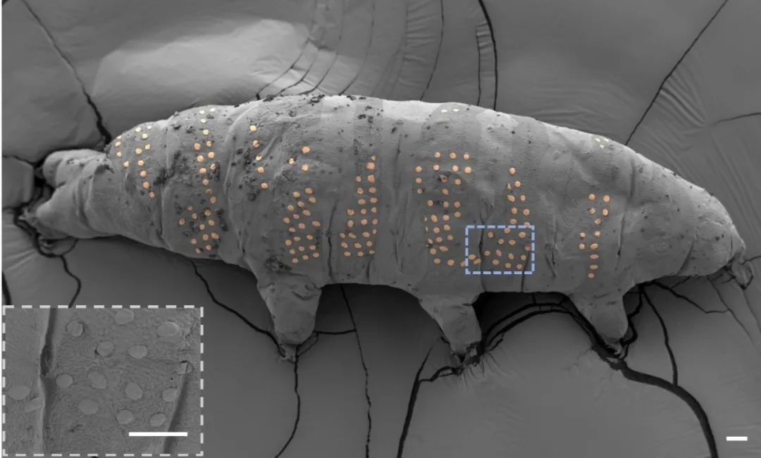 在實驗中,楊治蓉先讓水熊蟲進入具有強抗逆性的隱生狀態,此時其代謝幾乎停止。緊接着,她將特製的納米有機冰膜覆蓋在水熊蟲身上。隨後,經過電子束曝光,指定區域的納米冰膜變為常温穩定的固體圖案,水熊蟲“紋身”成功了!