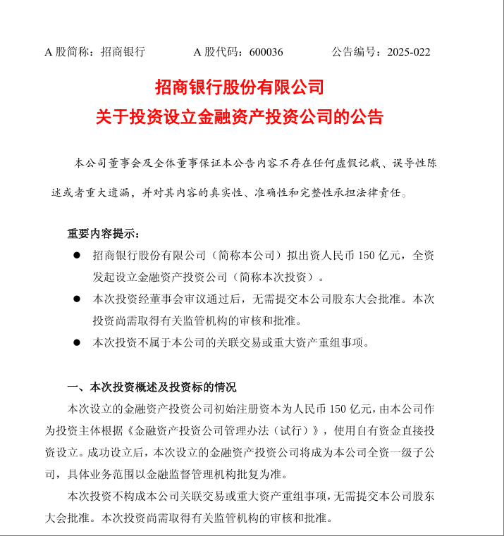 【環球網金融綜合報道】5月8日,招商銀行發佈公告稱,擬出資人民幣150億元,全資發起設立金融資產投資公司(AIC)。此外,該行提到,由公司作為投資主體根據《金融資產投資公司管理辦法(試行)》,使用自有資金直接投資設立。成功設立後,本次設立的金融資產投資公司將成為公司全資一級子公司,具體業務範圍以金融監督管理機構批覆為準。