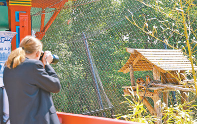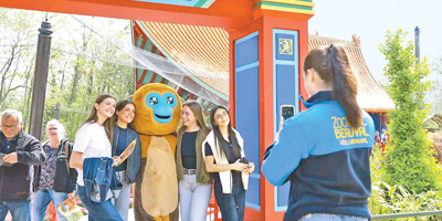 在博瓦勒野生動物園,遊客同身着金絲猴玩偶服的工作人員合影留念。