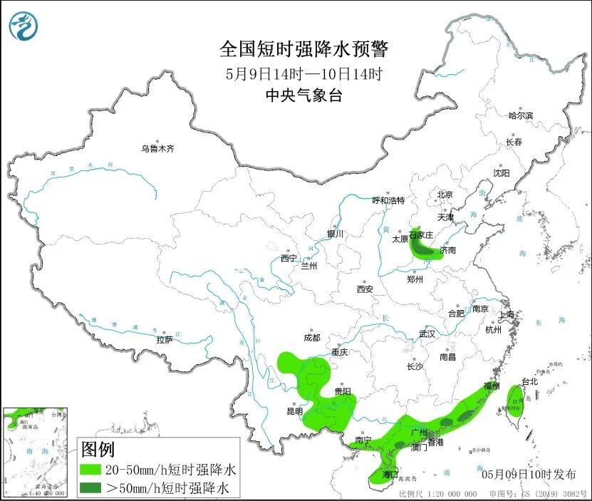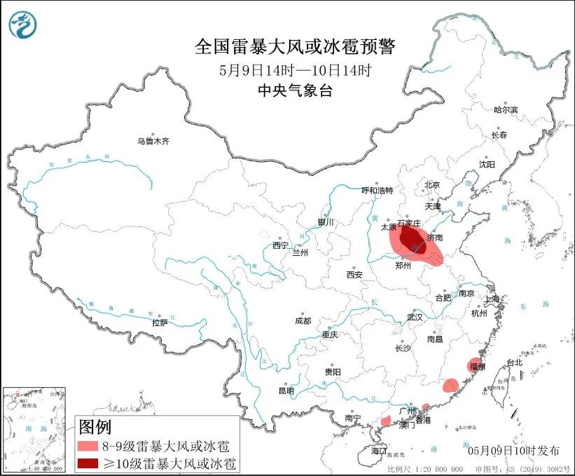 預計5月9日14時至10日14時,華北南部、黃淮北部、華南東部等地的部分地區將有8級以上雷暴大風或冰雹天氣 ,其中,河北南部、山東西部、河南北部等地的部分地區將有10級以上雷暴大風,最大風力可達11級以上 ;華北南部、黃淮北部、西南地區東南部、華南西部和南部等地的部分地區將有小時雨量大於20毫米的短時強降水天氣,其中,河北南部、河南北部、福建東南部、廣東南部、海南島東北部等地的部分地區小時雨量大於50毫米,最大可達80毫米以上。