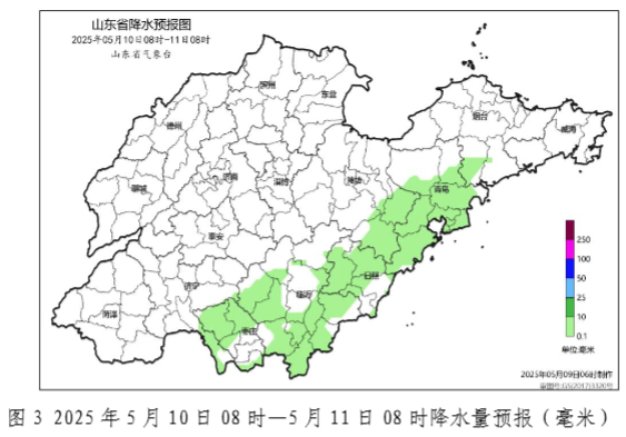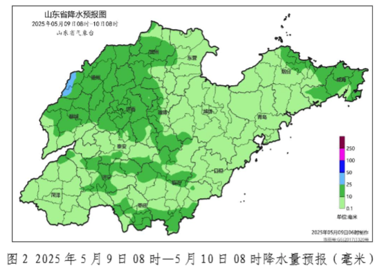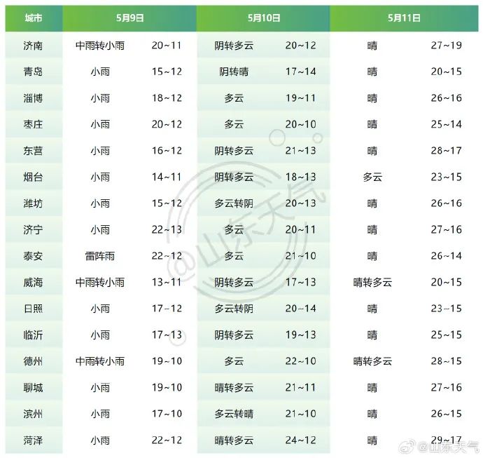 9日白天到夜間,全省天氣陰,魯西北和魯中大部地區有小到中雨局部大雨並伴有雷電,魯南地區有雷雨或陣雨局部中到大雨,其他地區有雷雨或陣雨局部中雨,聊城、泰安南部、菏澤、濟寧和棗莊局部有冰雹。濰坊、日照和半島地區北風4~5級陣風7~9級,其他地區南風3~4級轉北風4~5級陣風6~7級,雷雨地區雷雨時陣風8~9級局部10~11級。