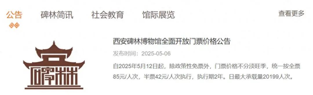據5月6日西安碑林博物館公告,西安碑林博物館改擴建工程在社會各界的關心與支持下,已具備開放條件。新館將於5月12日實現全面開放,與此同時,除政策性免票外,門票價格不分淡旺季,統一按全票85元/人次,半票42元/人次執行,執行期2年。日最大承載量20199人次。