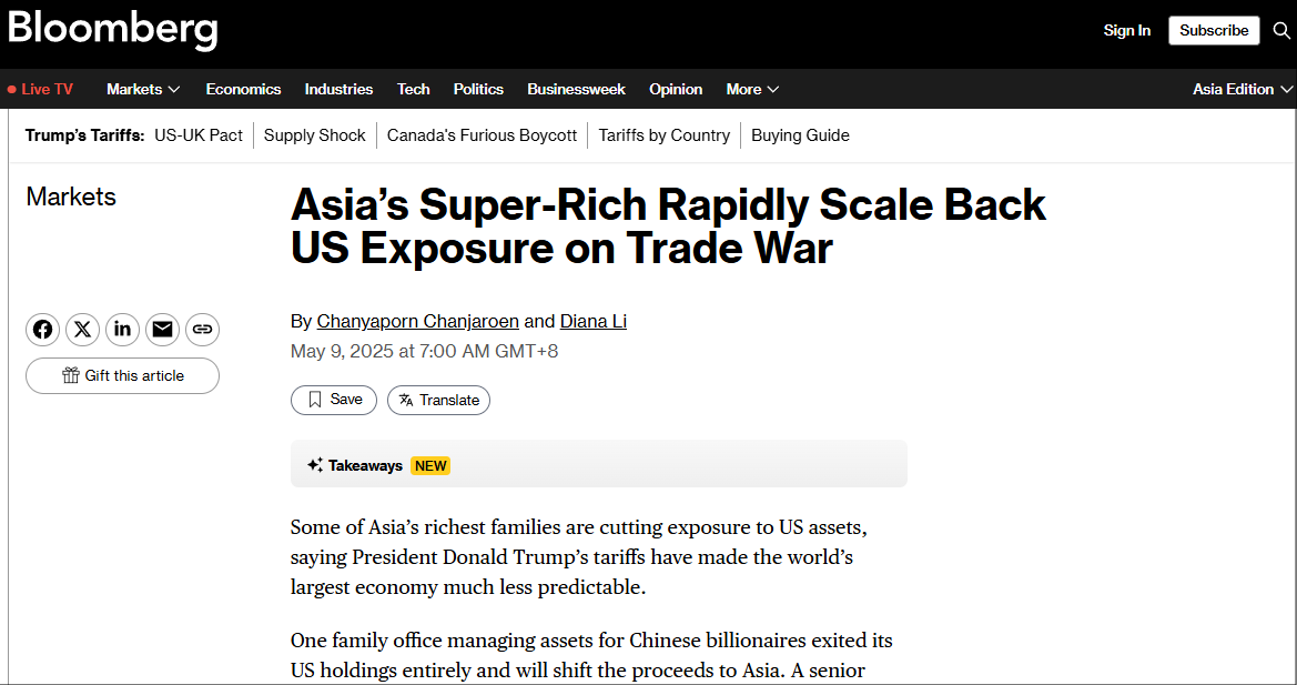 【環球網財經綜合報道】 在全球經濟格局劇烈動盪的背景下,亞洲頂級富豪家族正以前所未有的速度撤離美國市場。據彭博社在內的多家媒體報道,包括香港Infinity Family Office在內的約10家管理數十億美元資產的超級富豪家族辦公室,已開始大規模減持或凍結在美股及美債的投資,並將資金重新配置至中國和歐洲市場,以應對美國政策不確定性與潛在的經濟衰退風險。