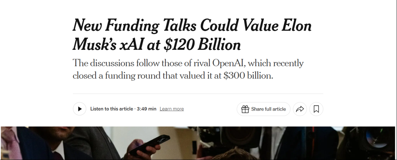 外媒表示,去年年底,投資者對人工智能公司的熱情有所降温,幾家備受矚目的初創公司實際上被谷歌和亞馬遜等科技巨頭收購。但 xAI 和 OpenAI 是少數仍在尋求數十億美元融資以打造領先人工智能技術的公司之一。(思瀚)