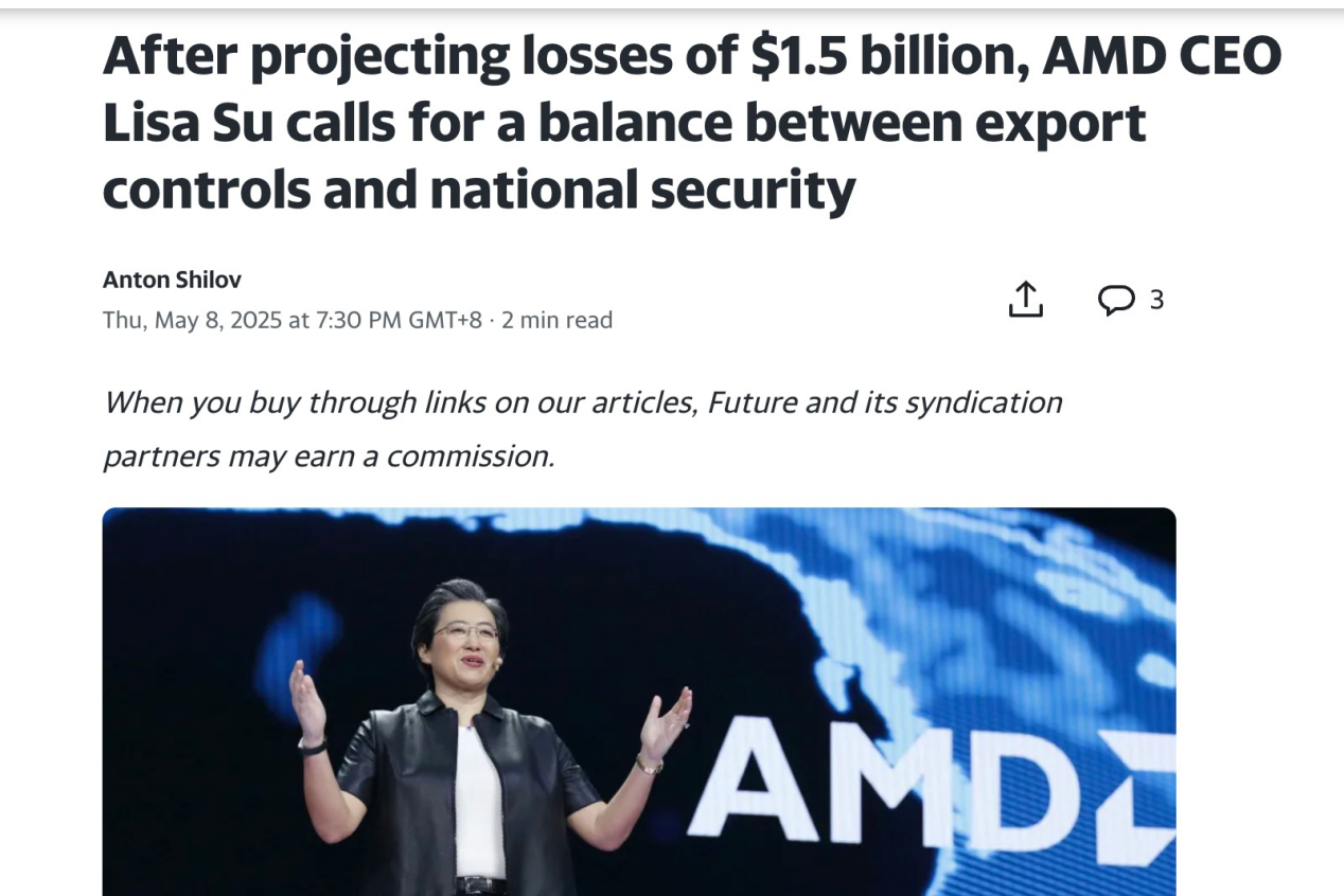【環球網科技綜合報道】就在AMD因美國出口管制而計入8億美元庫存費用,並預計2025年總損失達15億美元后的第二天,該公司首席執行官蘇姿豐表示,必須在出口管制與技術應用方面取得平衡。她表示,中國是全球最大的市場,為美國企業帶來巨大的機遇。