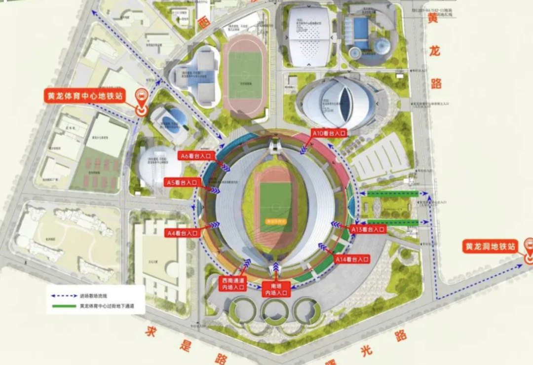 B口出站後步行途經曙光路-黃龍路-東廣場抵達黃龍體育中心體育場