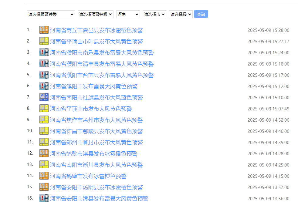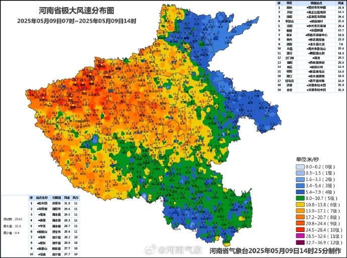 降水和冰雹:5月9日12時至14時,我省北部出現小到中陣雨、雷陣雨,局部伴有短時強降水、雷暴大風、冰雹等強對流天氣。最大累計降水量為安陽市清裕16.6毫米,最大小時降水量為安陽市清裕16.6毫米(5月9日13時至14時)。鶴壁淇濱區(12:38)、廟口鎮區(13:13)、鶴壁市濬縣新鎮(13:40)、安陽滑縣(14:00)、安陽林州東崗鎮和東姚鎮(14:10)局部出現1到2釐米的冰雹。 大風:5月9日7時至14時,我省中西部、西北部、西南部出現8到9級陣風,局地10到11級。8級及以上的有56個縣(市、區)共381站。風速前三站分別為:柏木凹31.0米/秒(11級)、孟津區寺院坡29.6米/秒(11級)、澠池29.5米/秒(11級)。