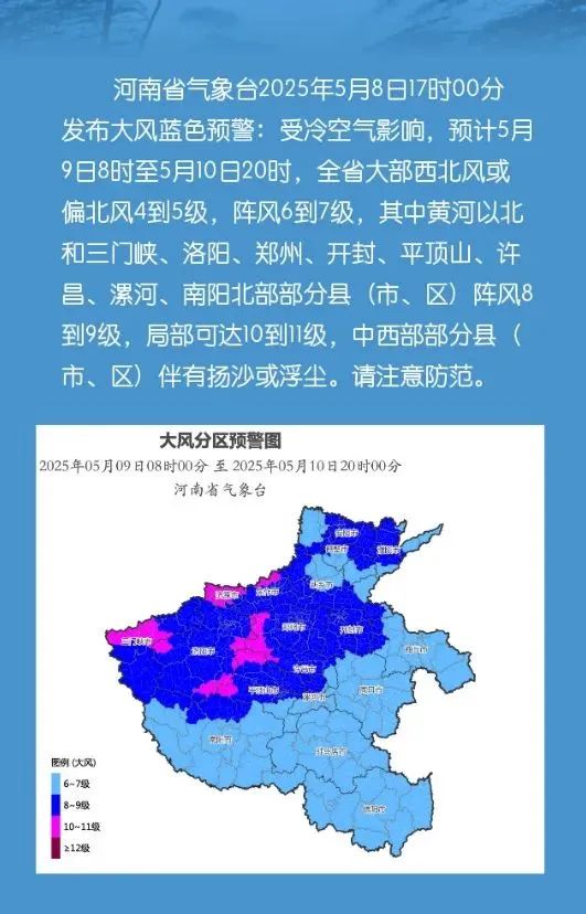當前,河南省大風藍色預警生效中,今天下午到明天白天,全省有4級左右西北風或偏北風,陣風6到7級,北部、中西部部分縣市8到9級,局部10到11級,西部伴有揚沙或浮塵;外出注意關緊門窗,加固臨時搭建物,外出遠離廣告牌等臨時搭建物,避開高樓之間的狹窄通道,謹防風力突然增大。