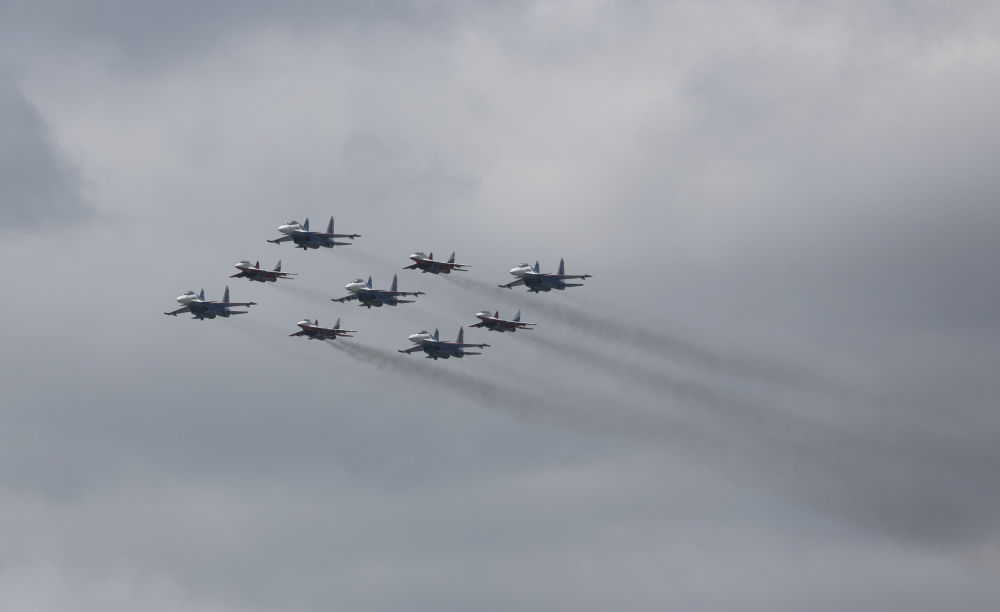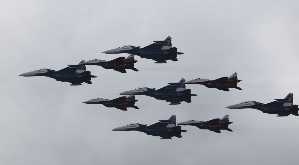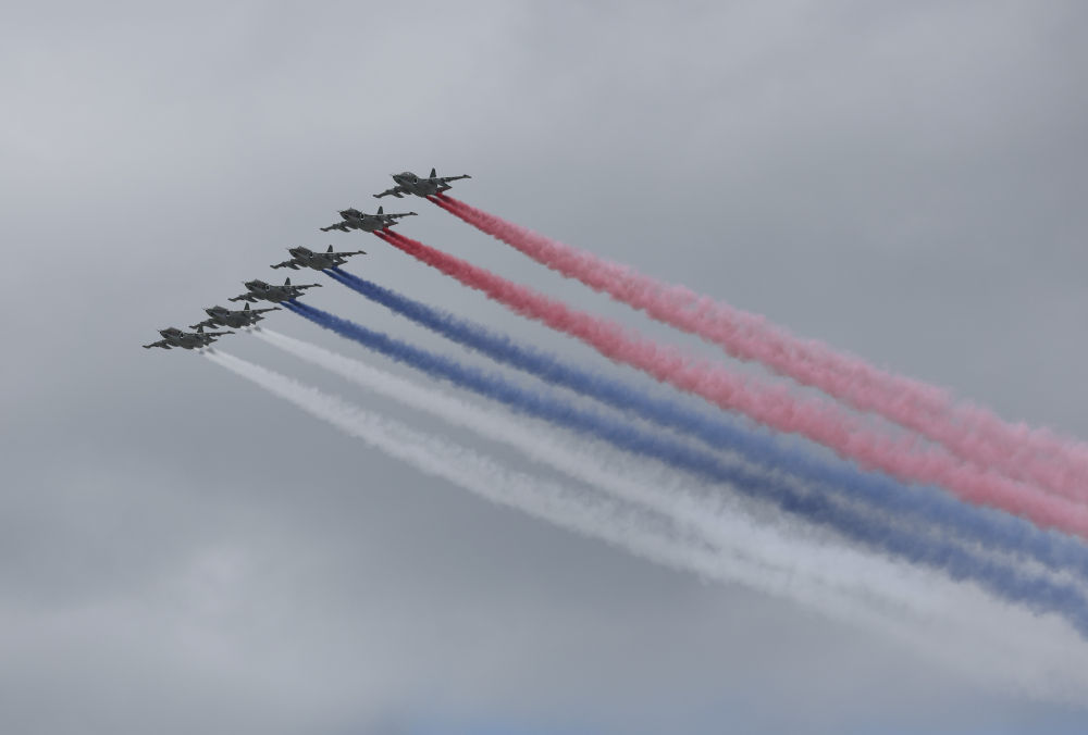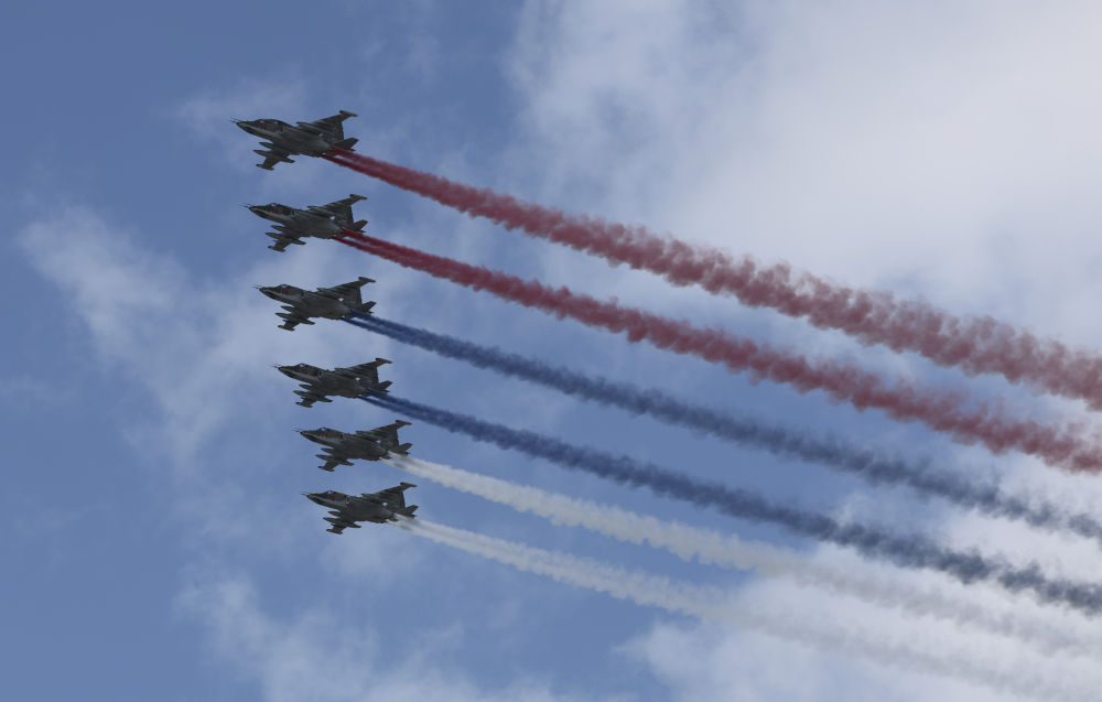 ↑ 5月9日,在俄羅斯首都莫斯科,戰機編隊參加紀念蘇聯偉大衞國戰爭勝利80週年閲兵式。 新華社記者 丁海濤 攝