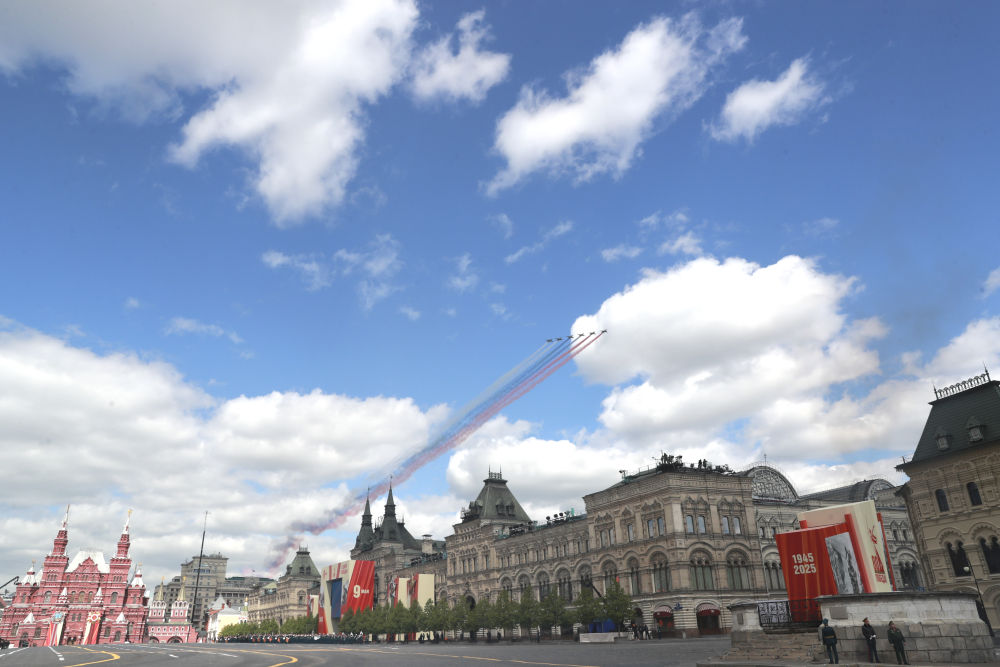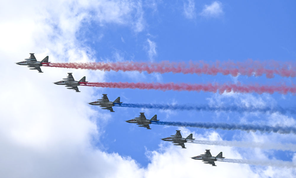 ↑ 5月9日,在俄羅斯首都莫斯科,參加紀念蘇聯偉大衞國戰爭勝利80週年閲兵式的戰機編隊拉煙飛行。新華社記者 張領 攝