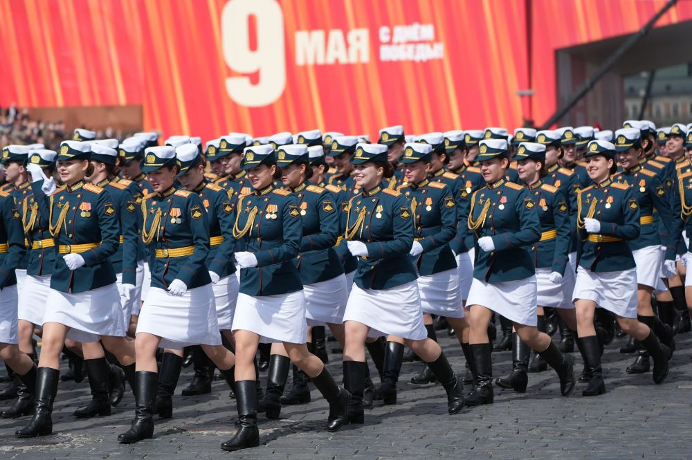 ↑ 5月9日,在俄羅斯首都莫斯科,女兵參加紀念蘇聯偉大衞國戰爭勝利80週年閲兵式。新華社記者 賴向東 攝