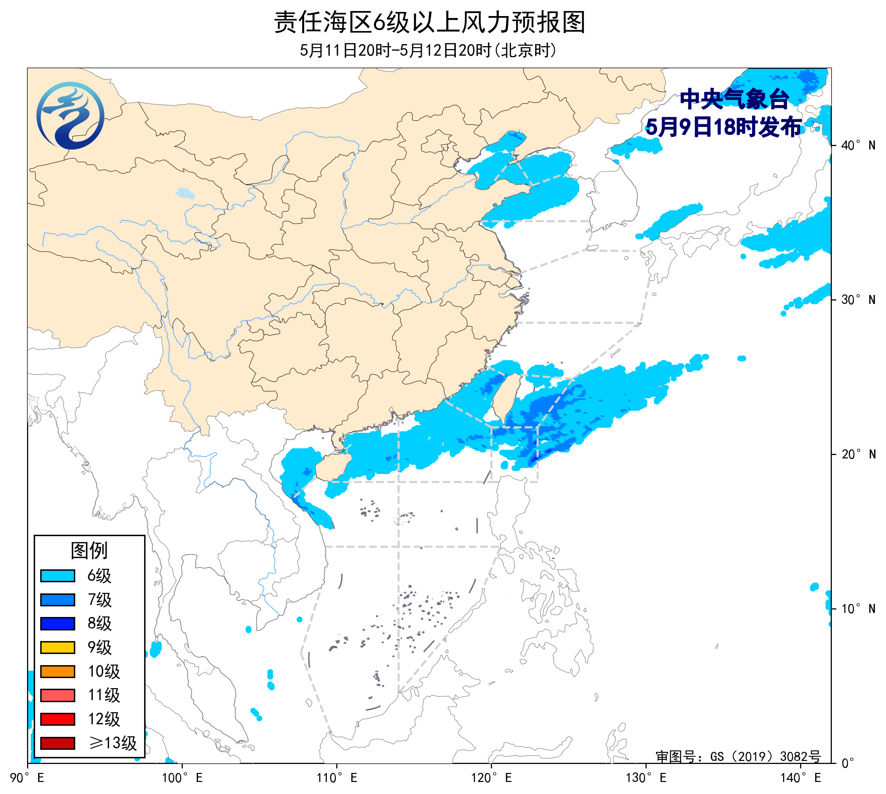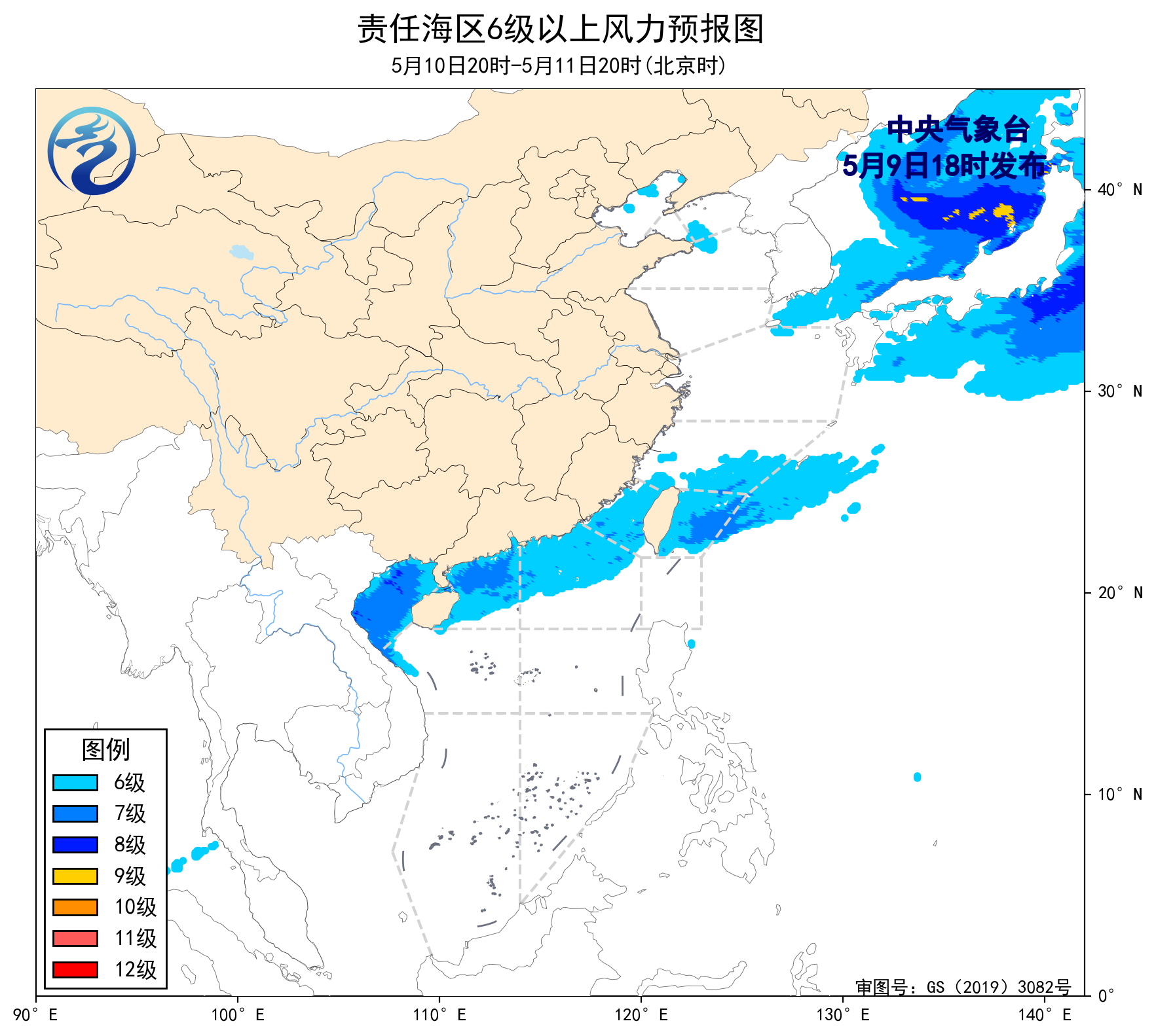 9日20時至10日20時,黃海中部海域將有6~8級、陣風9級的偏西風,黃海南部海域、東海北部海域將有7~8級、陣風9級減弱到5~6級、陣風7級的偏西風,渤海、渤海海峽、黃海北部海域將有6~7級、陣風8級的偏西到西北風,東海南部海域將有5~6級、陣風7級的偏西轉東北風,台灣以東洋麪將有5~6級、陣風7級的西南風轉東北風。