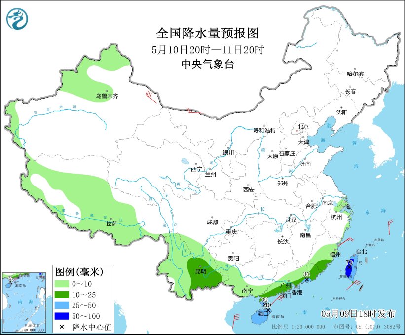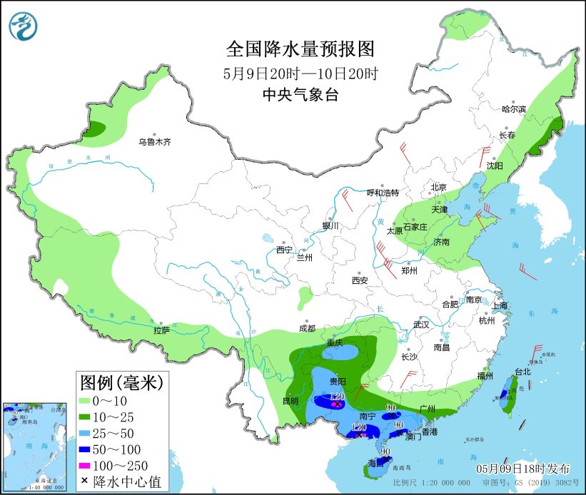 *5月9日20時至10日20時,*四川盆地南部、貴州大部、雲南東部、湖南西部、廣西西部和中南部、廣東中西部和東南沿海地區、海南島、台灣島以及吉林東部等地部分地區有中到大雨,其中,貴州南部、雲南西南部、廣西西部和中南部、廣東西南沿海地區、海南島北部等地部分地區有暴雨,局地大暴雨(100~120毫米)。新疆北疆山區和南疆盆地、內蒙古中東部、遼寧大部、吉林中部、陝西中北部、山西中南部、河北南部和西北部、河南、安徽中部、湖南南部、貴州南部、廣西北部等地部分地區有5~6級、陣風7~8級,其中,山西西南部、河南西北部等地的部分地區平均風力可達7級以上,陣風8~10級(見圖2)。