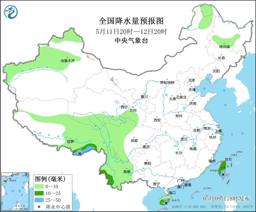 *5月11日20時至12日20時,*新疆北部和南疆西部山區、西藏、青海南部、甘肅西南部、川西高原、雲南、海南島、台灣島等地部分地區有小到中雨,其中,西藏東南部、海南島南部、台灣島南部等地部分地區有大雨(25~45毫米)。新疆東部、甘肅河西等地部分地區有4~5級風,台灣以東洋麪、台灣海峽、巴士海峽、北部灣、南海北部海域有4~7級風、陣風8級(見圖4)。