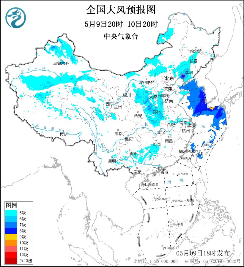 5月9日20時至10日20時,新疆北疆山區和南疆盆地、內蒙古中東部、遼寧大部、吉林中部、陝西中北部、山西中南部、河北南部和西北部、河南、安徽中部、湖南南部、貴州南部、廣西北部等地部分地區有5~6級、陣風7~8級,其中,山西西南部、河南西北部等地的部分地區平均風力可達7級以上,陣風8~10級;渤海北部、渤海海峽、黃海大部海域、東海東北部海域將有7~8級、陣風9~10級的大風,其中東海東北部部分海域風力可達9級,陣風10~11級(見圖1)。中央氣象台5月9日18時繼續發佈大風藍色預警。