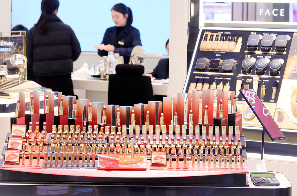 2025年3月底,江蘇常州的一個美國品牌門店的美妝產品展示櫃(圖自視覺中國)