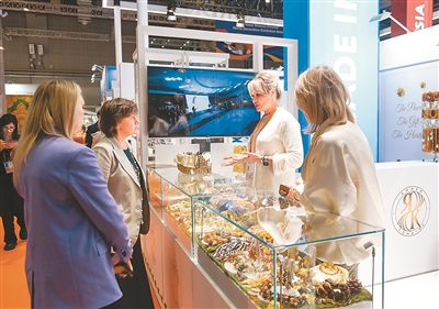在第七屆進博會消費品展區俄羅斯出口中心展位,客商進行交流。