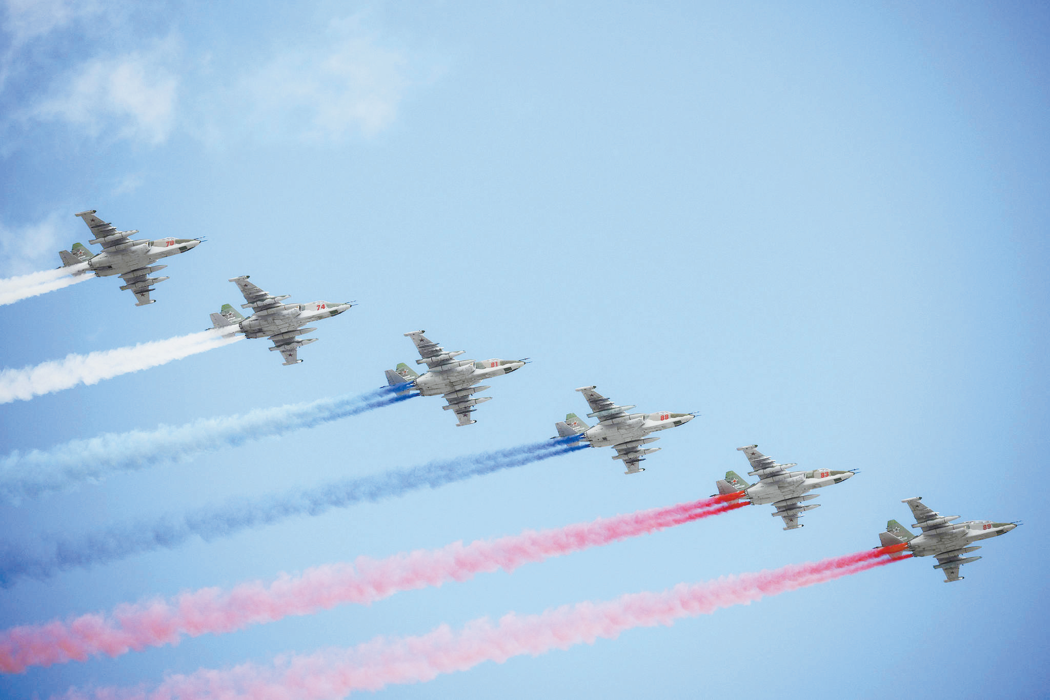 此外,在閲兵活動中,由6架蘇-25攻擊機組成的編隊在紅場上空飛過,機尾噴出俄羅斯國旗白、藍、紅三色彩煙。