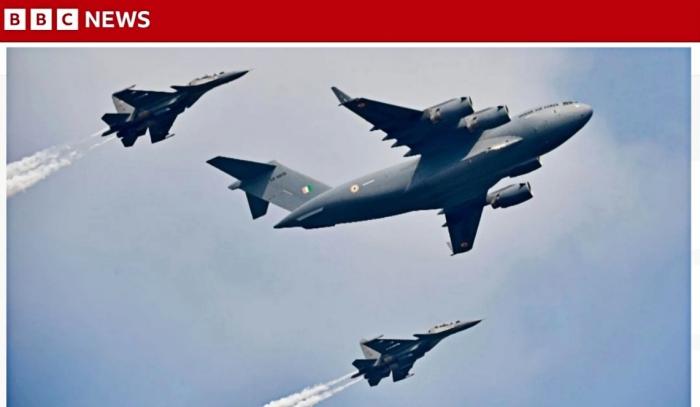 印軍戰鬥機伴隨運輸機飛行。圖/英國廣播公司網站報道