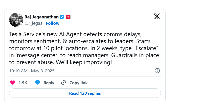 特斯拉人工智能與信息技術基礎設施、網絡安全及車輛服務部門負責人拉吉·傑甘納森本週在社交平台上表示,公司正在推出一款專門設計的人工智能客服代理,用於處理與客户的服務溝通。