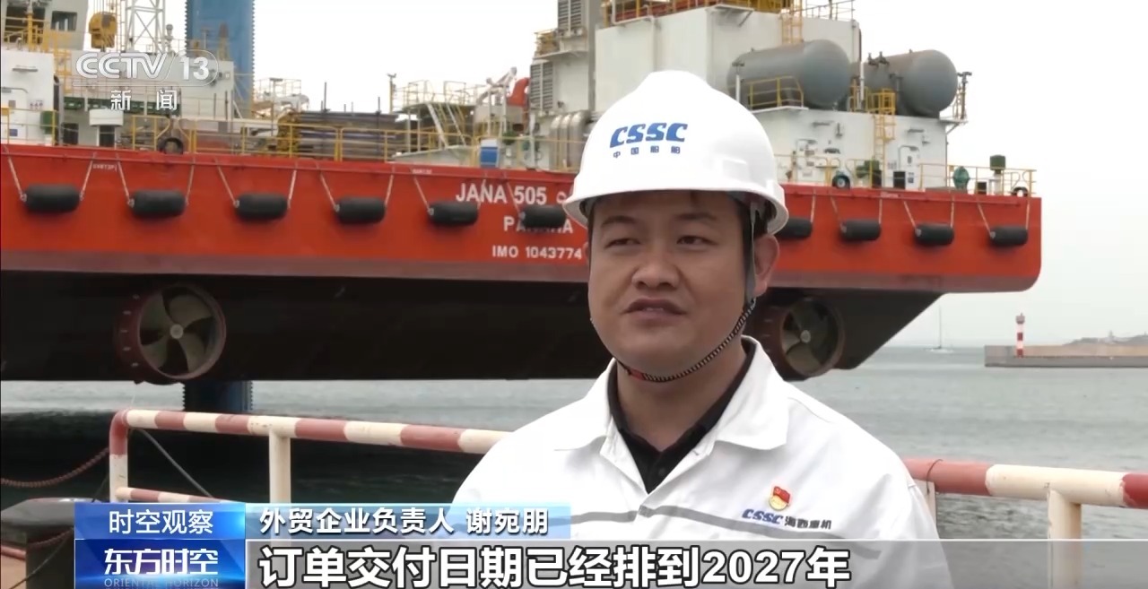*外貿企業負責人**謝宛朋:*目前,在建外貿平台及港機設備40餘台,訂單交付日期已經排到2027年。