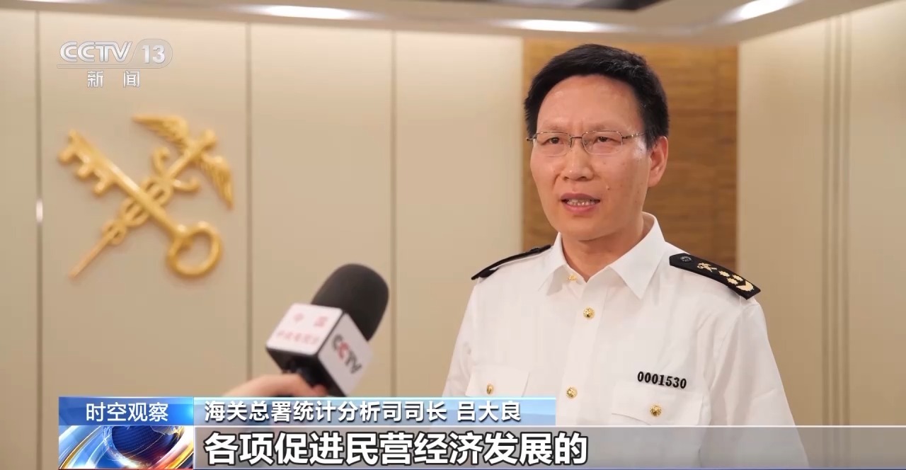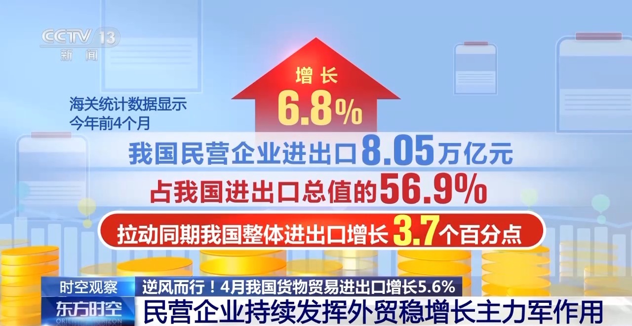 *海關總署統計分析司司長 呂大良:*今年以來,各項促進民營經濟發展的政策措施協同發力,參與外貿的民營企業數量穩定增加。前4個月,有進出口實績的民營企業達49.2萬家,增加8.2%,佔我國有進出口實際企業數量的86.5%。