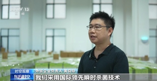 *外貿企業負責人 黃良導:*我們採用國際領先瞬時殺菌技術,產品營養保留率超95%。截止到今年4月,產品已覆蓋全國31個省市,進入大型商超以及多家連鎖便利店渠道,合作終端網點30萬家,同比增長22.5%。