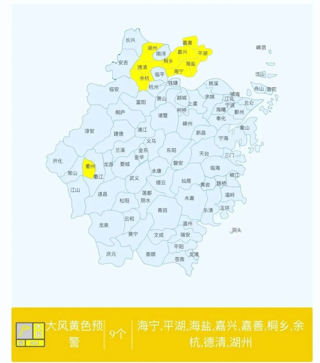此外,海寧、平湖等地也發佈大風黃色預警。