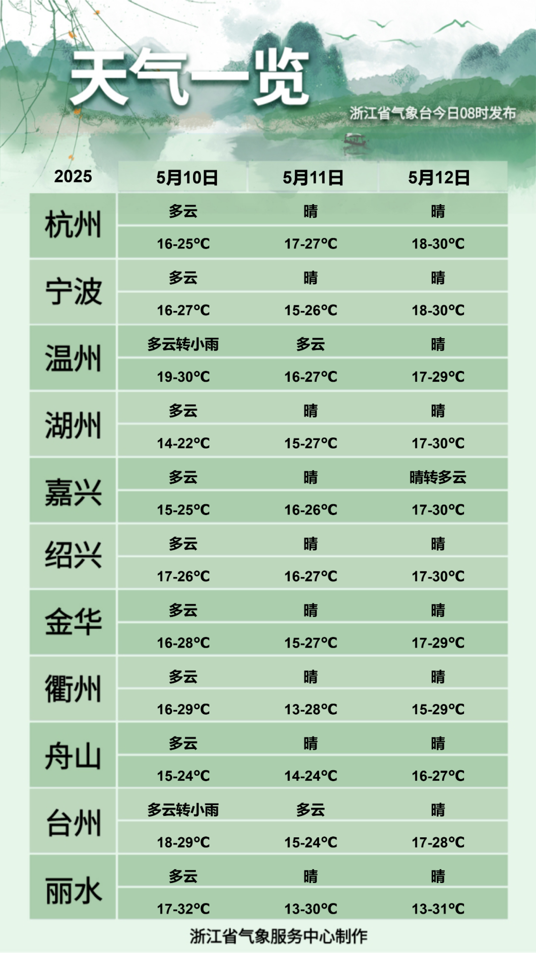 值得注意的是,今天(10日)全省多雲,其中浙北北部和東南沿海地區傍晚起轉陰部分偶有小雨。另外,今天浙江內陸部分有6-8級陣風,高山區和江河湖面個別9-10級。