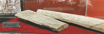 展櫃中看似普通的兩塊木頭,實為文物“消息樹”。樹皮上,“中國報”等字跡仍能辨認。
