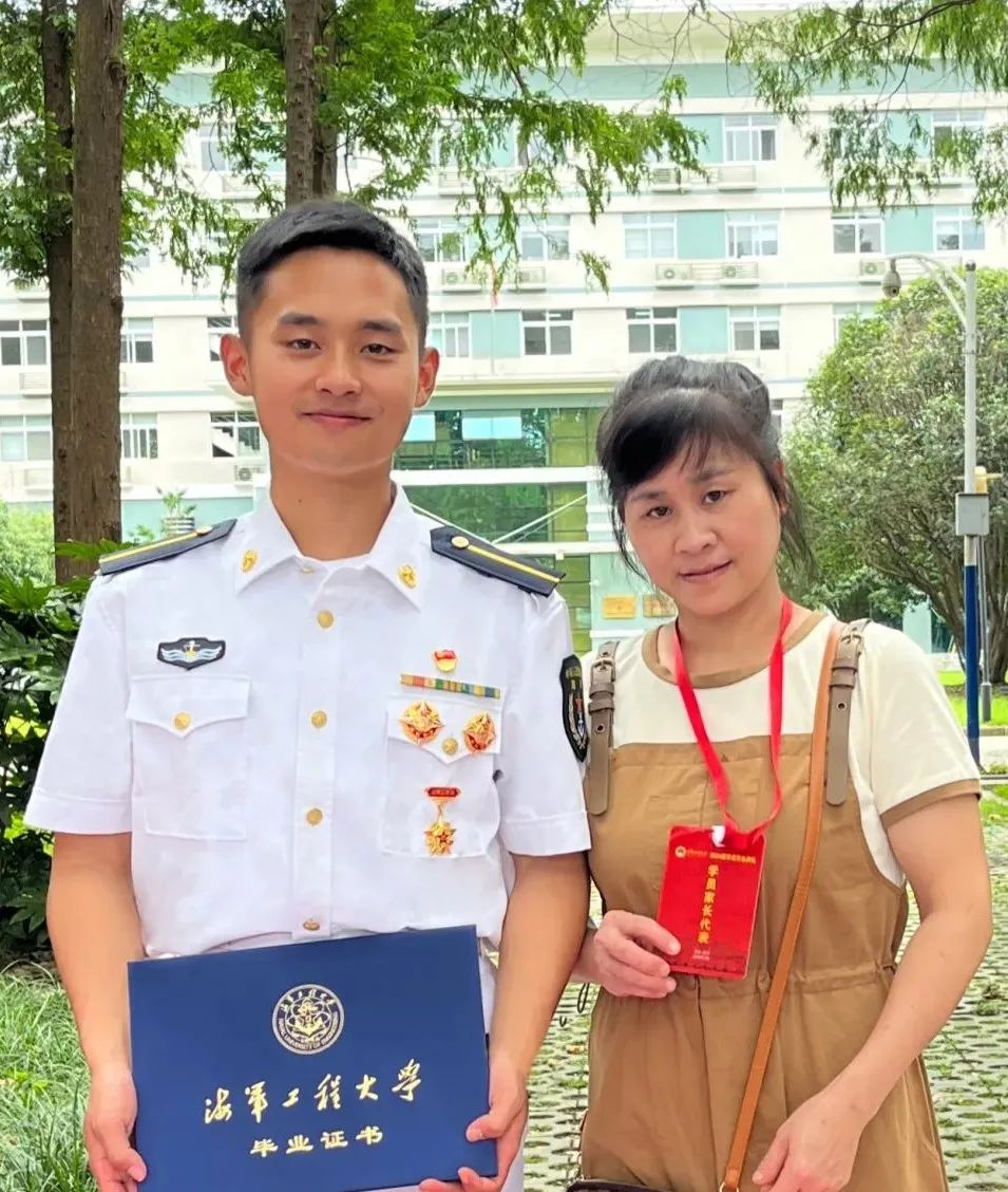 *馮劉俊:*在畢業典禮上,母親見證了我的榮耀時刻。小時候,是她彎着腰小心翼翼護着蹣跚學步的我;而今,已經長大的我挽着她的手臂,陪她漫步在校園的小路上,向她講述着這些年奮鬥的點點滴滴。母親一邊聽我説,一邊不停地點頭,還不時地問我:“平時訓練累不累?”“食堂的菜可還吃得慣?”再尋常不過的話語裏,藏着母親沒有説出口的牽掛。