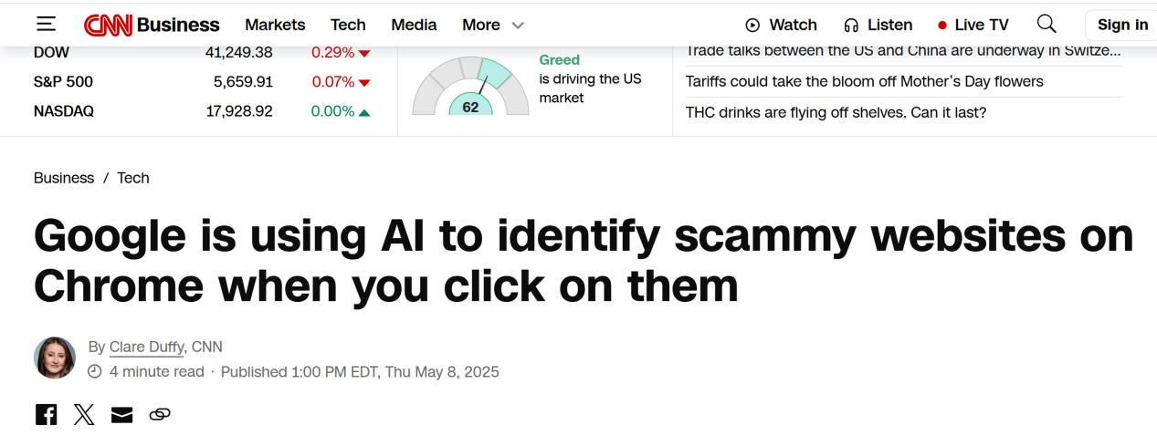 【環球網科技綜合報道】5月11日消息,據CNN報道,谷歌公司近日宣佈在其旗下應用及搜索引擎中全面引入AI反詐系統,利用先進的人工智能技術精準識別並攔截潛在惡意網站,有效打擊網絡詐騙行為,為用户營造更加安全的網絡環境。