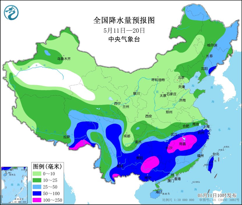 未來10天(5月11-20日),江南、華南西部、貴州、四川西部、西藏東部、雲南東部等地累計降水量有50~80毫米,其中江南中部、華南西部、雲南東南部的部分地區有80~120毫米,局地超過150毫米;新疆沿天山一帶、東北地區東部和北部等地部分地區累計降水量有15~30毫米,局地超過50毫米;江南中部、雲貴大部、東北北部和東部、川西高原等地累計降水量較常年同期偏多2~6成,部分地區偏多1~2倍,我國其餘大部地區降水偏少。
