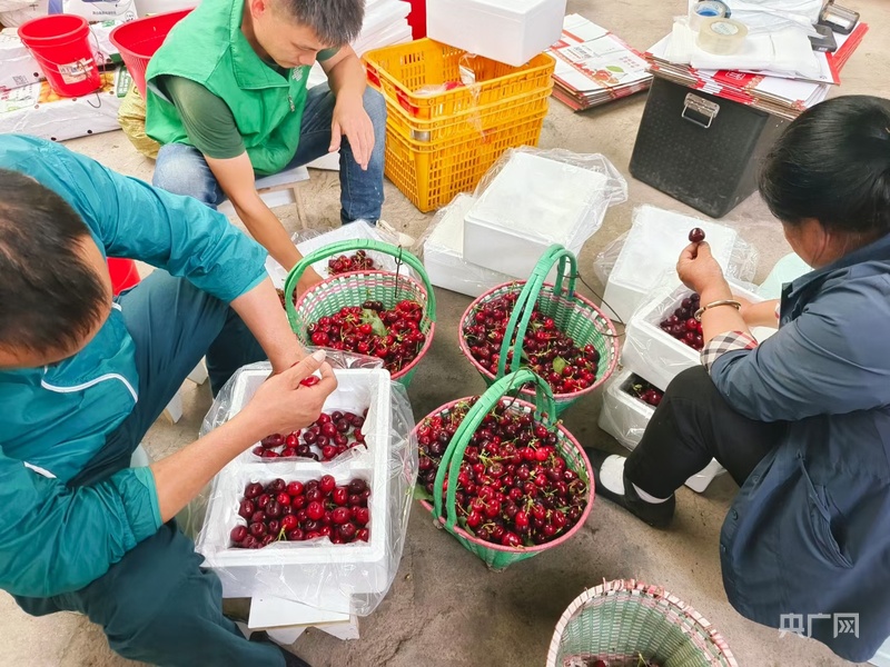 村民正在給車釐子打包裝箱(央廣網發 馬文豪 攝)