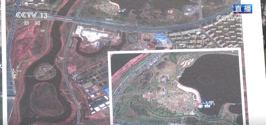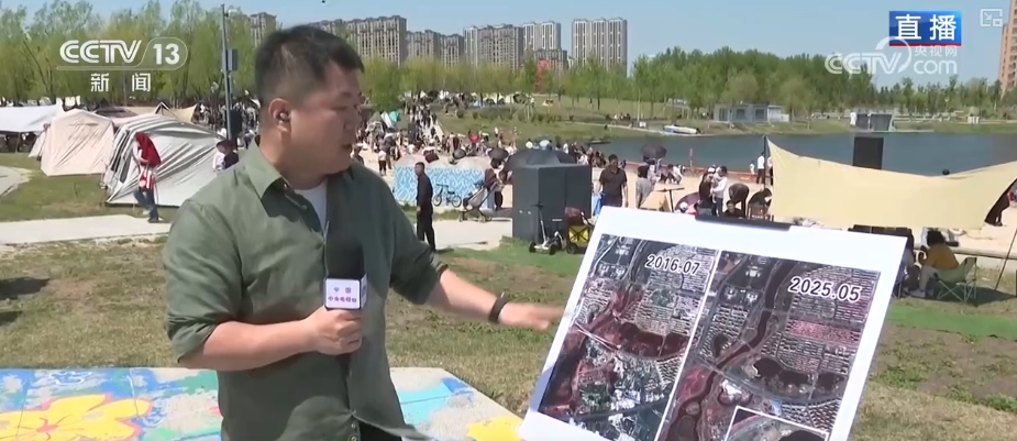 這項工程就是啓動於2016年的伊通河綜合治理工程。通過吉林一號衞星拍攝的影像可以看到,這是2016年7月的伊通河,河面上遍佈着的刺眼的綠色物質,是當時黑臭水體滋生出的藻類,部分河道里呈現出渾濁的黃褐色,南溪濕地當時還是一片黃土裸露的荒草水塘。這是2025年5月衞星影像,伊通河中成片的藻類不見了,呈現出純淨的的水體,河道恢復到乾淨、整潔。而南溪濕地中的樹木植被清晰可見,這些五顏六色的斑點,就是我們旁邊這塊帳篷營地上各式各樣的帳篷,看上去非常壯觀。