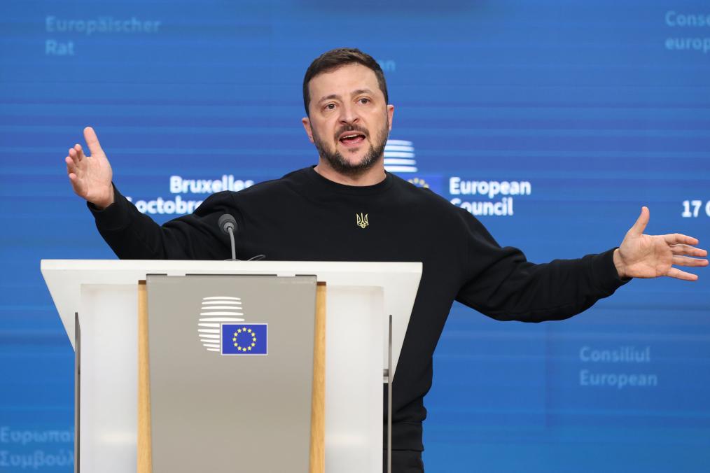 2024年10月17日,在比利時布魯塞爾,烏克蘭總統澤連斯基在歐盟峯會上參加新聞發佈會。新華社記者趙丁喆攝