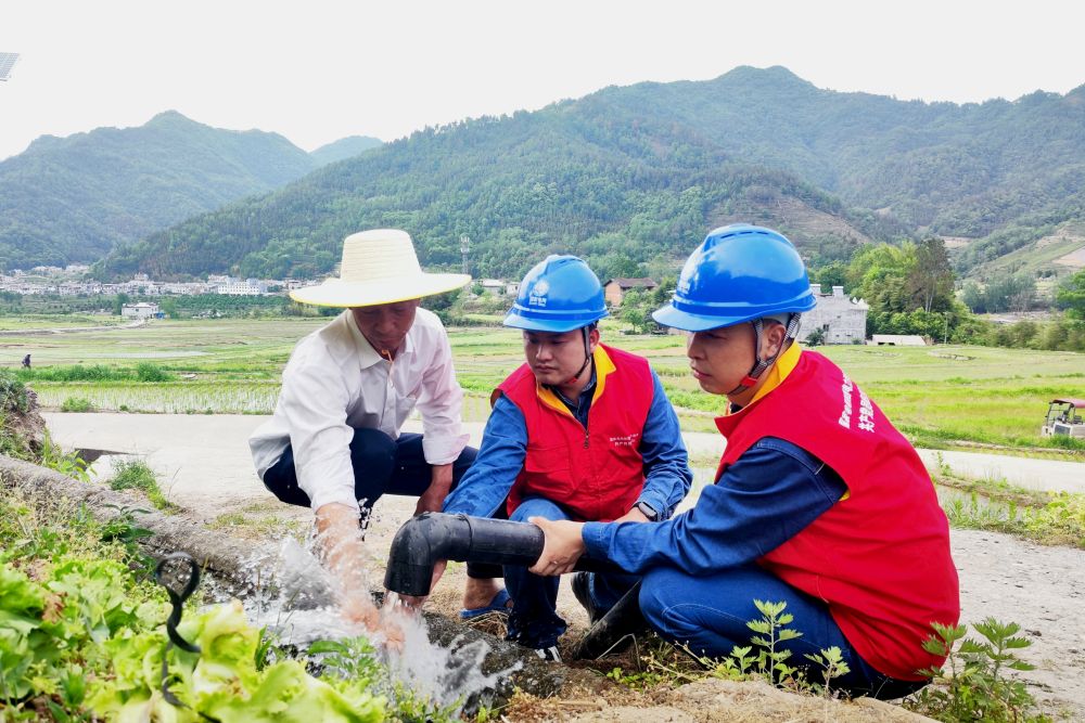 國家電網陝西省平利縣供電公司黨員服務隊在陝西平利縣秋河村幫助農户調試抽水水泵。(陳思源 攝)