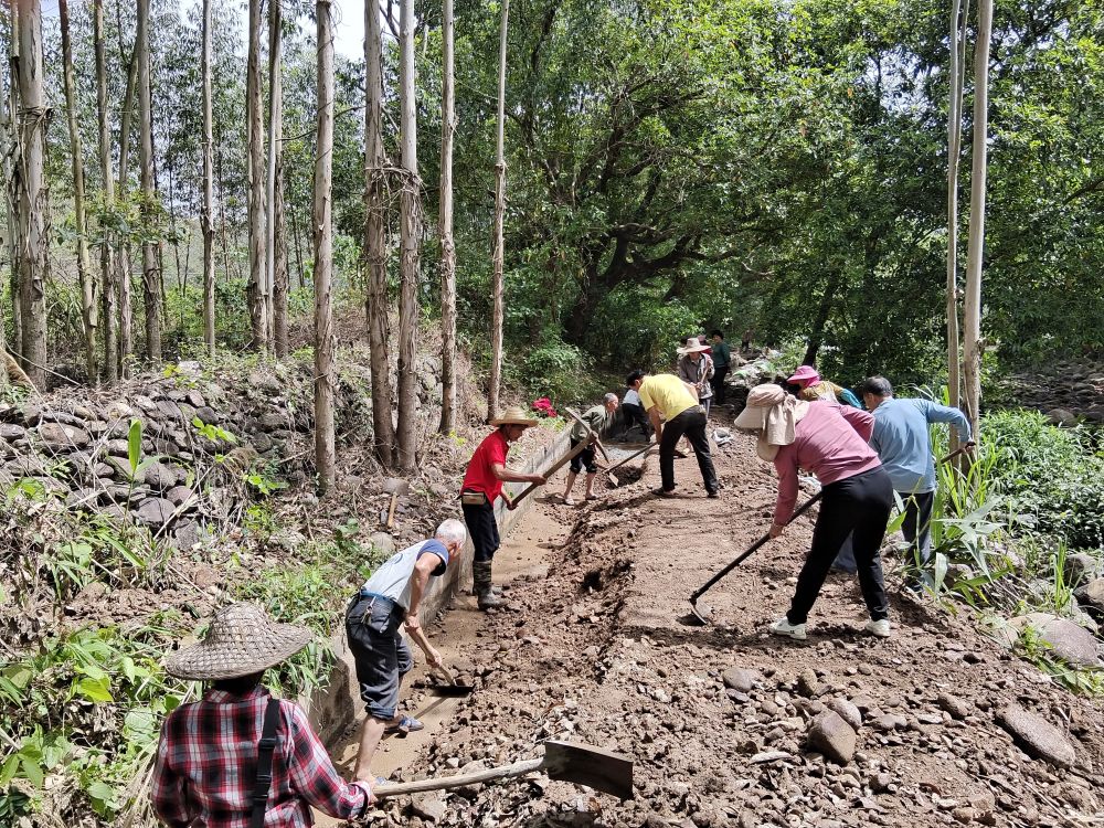 廣西武宣縣東鄉鎮屯應村黨員幹部與羣眾一起修水渠抗旱。(雷正曉 攝)