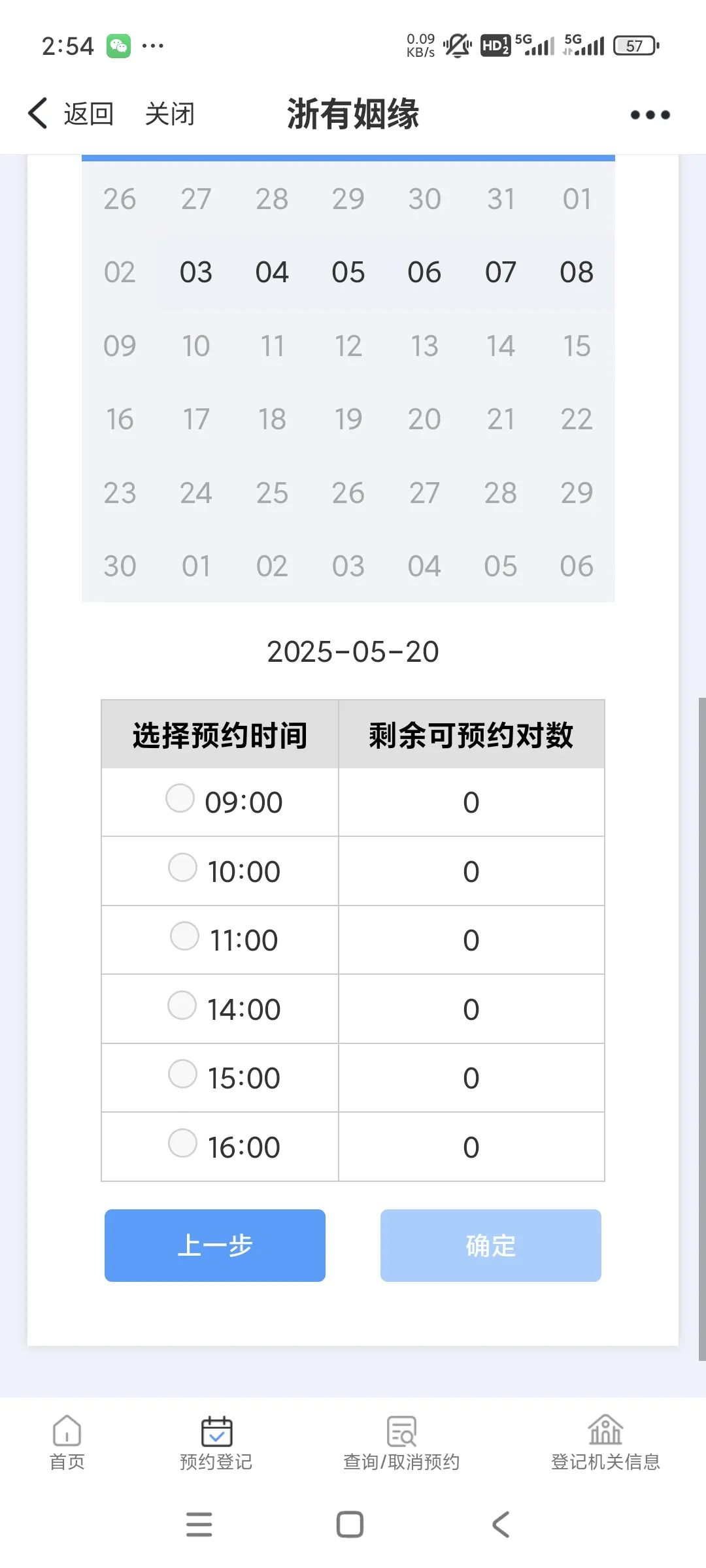 5月9日下午,潮新聞記者查詢杭州主城區婚姻登記處預約情況。截至9日15點,上城區、拱墅區、西湖區、蕭山區、餘杭區、臨平區、濱江區、錢塘區以及建德市九個婚登處,僅有建德婚登處還有少量餘號,其餘全時段均已約滿。