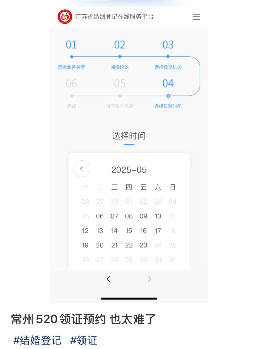 據“常州發佈”微信公眾號消息,今年,常州市婚姻登記處5月20日、5月21日結婚預約登記已滿。為此,常州一網友直呼:“520領證太難了!”