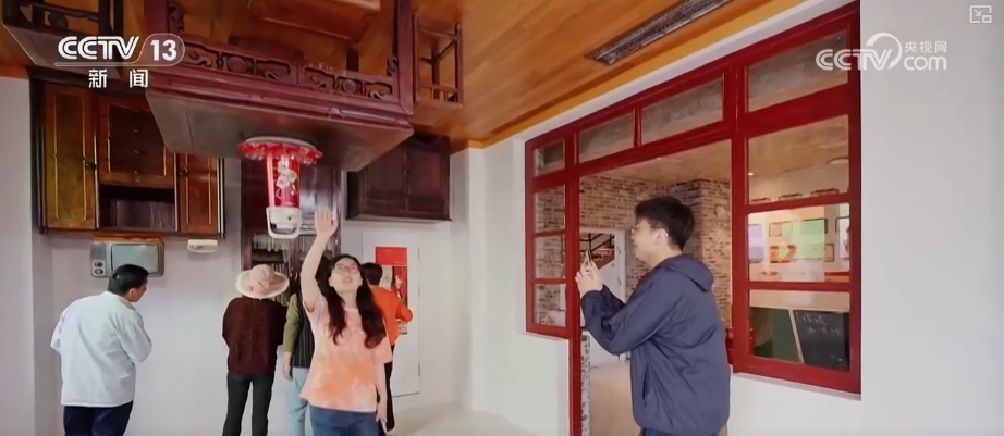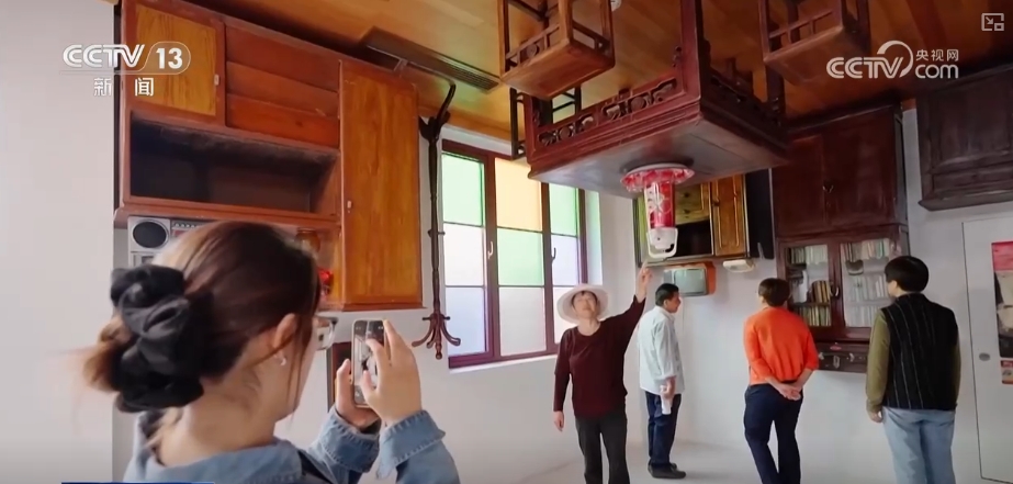 在無錫市錫山區談村鄉村博物館的“倒立屋”前,一批批遊客和新農人正興奮地擺出騰空姿勢。談村“倒立屋”經過建築師的巧妙設計,沙發懸頂、吊燈“長”在地面,穿越感滿滿。